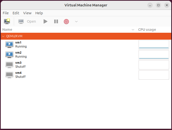 在終端機中輸入 virt-manager,或是 Apps 選單中啟動虛擬機管理器,透過 GUI 介面來建立新的虛擬機。