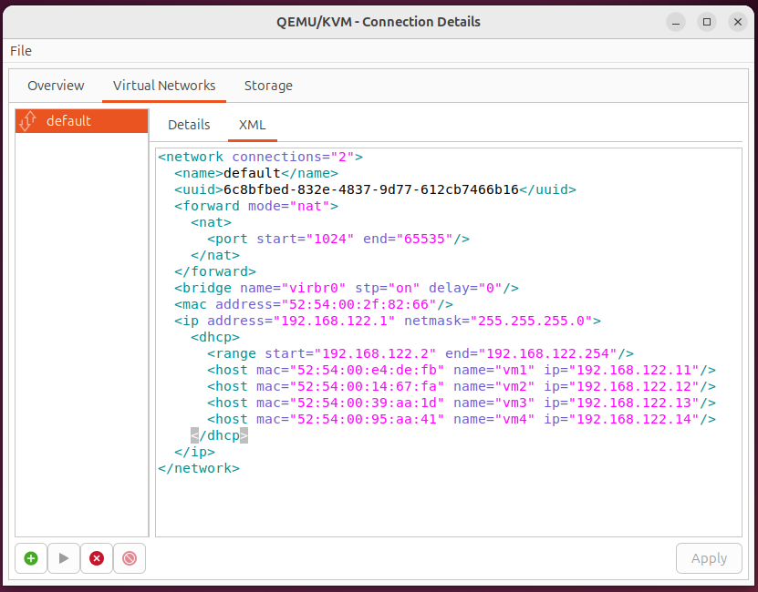 <host mac="52:54:00:e4:de:fb" name="vm1" ip="192.168.122.11"/>